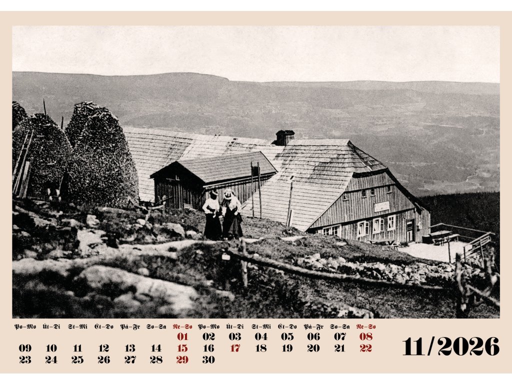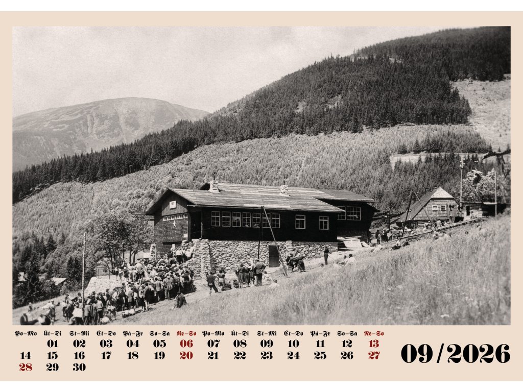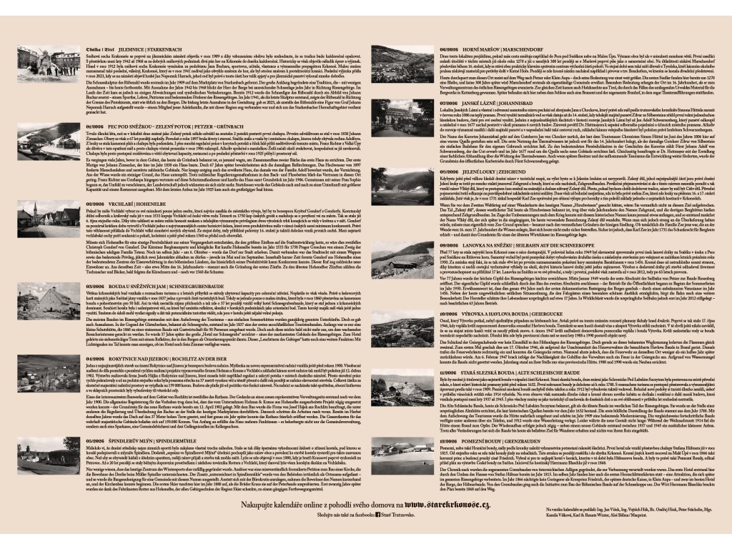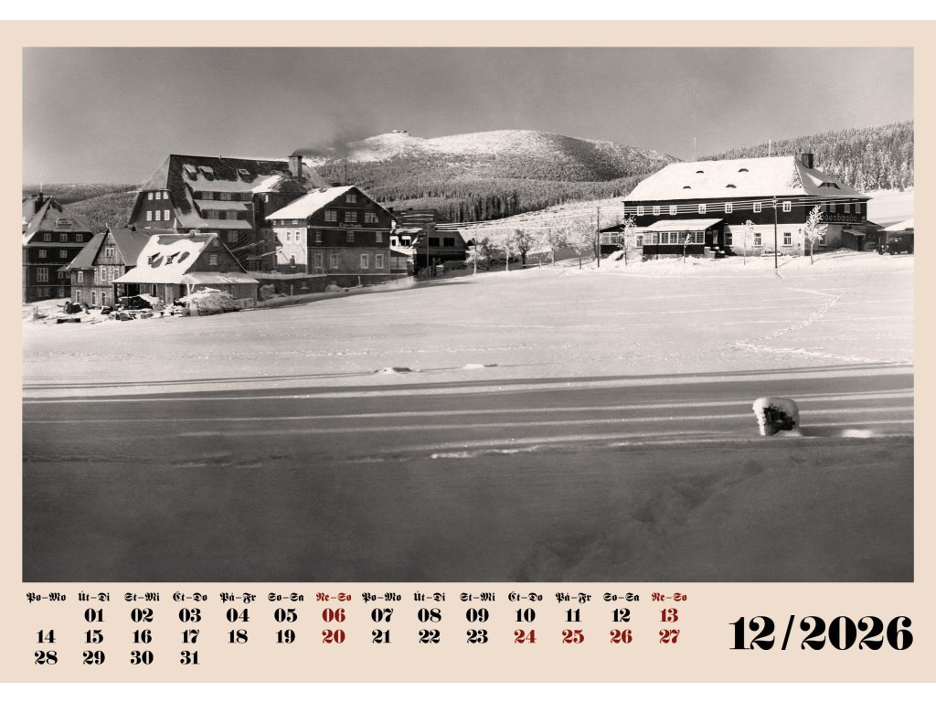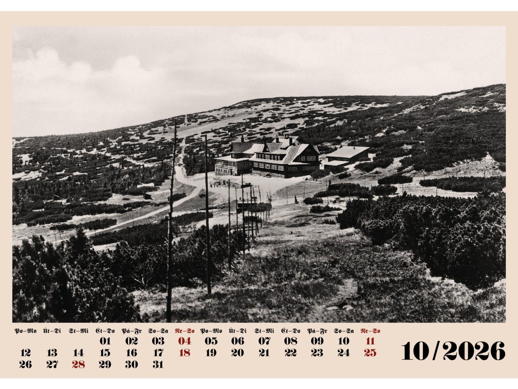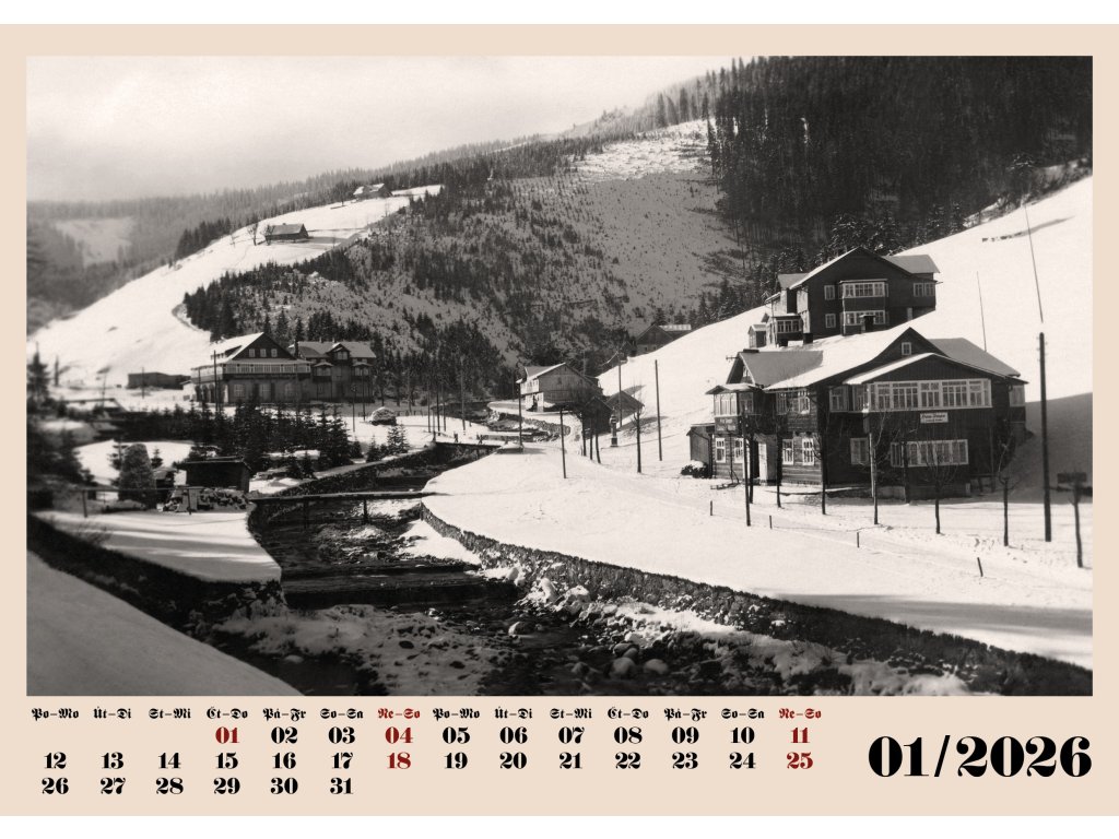 A jaká místa v kalendáři pro rok 2026 navštívíme? Jilemnici, Zelený potom v Peci pod Sněžkou, Sněžné jámy, Rokytnici nad Jizerou, Špindlerův Mlýn, Horní Maršov, starou lanovku na Sněžku, Vrchlabí, Janské Lázně, Jelení louky, Výrovku s Havlovou boudou, Starou slezskou boudu a Pomezní Boudy.