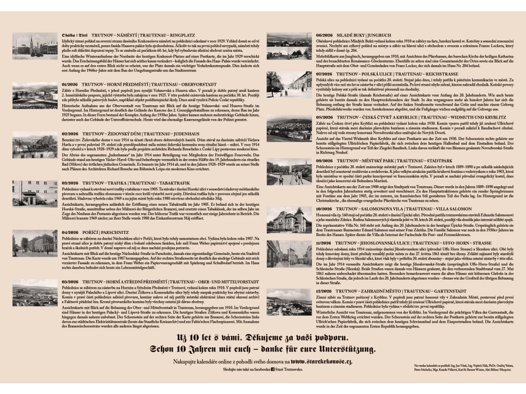 A jaká místa starého Trutnovska v kalendáři navštívíme? Náměstí, Horní Předměstí, Židovský dům, novou trafiku na Horské ulici, Poříčí, Horní a Střední Předměstí, Mladé Buky, Polskou ulici, Českou čtvrť, Kryblici, městský park, Salomonovu vilu, Jihoslovanskou ulici a Zahradní město.